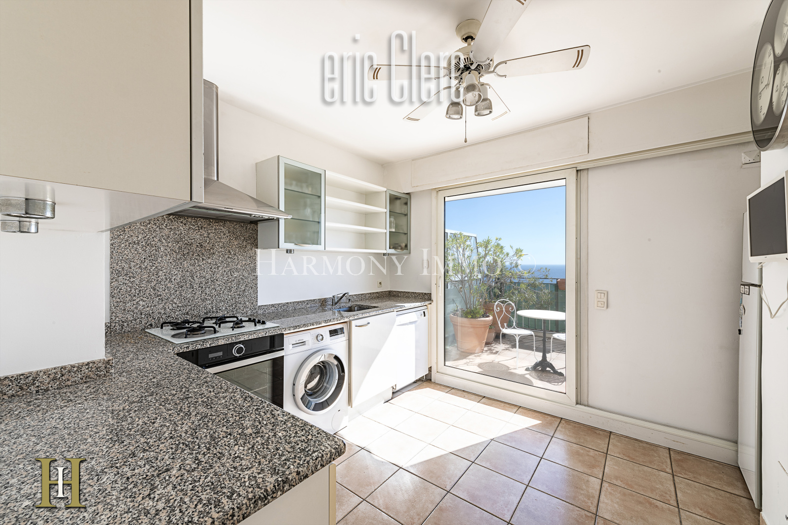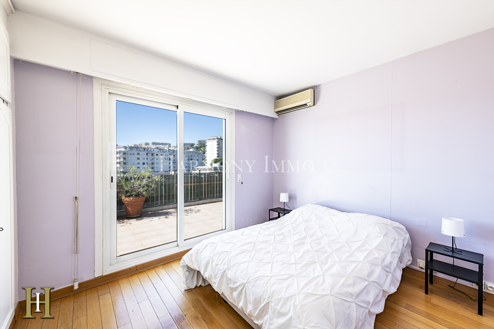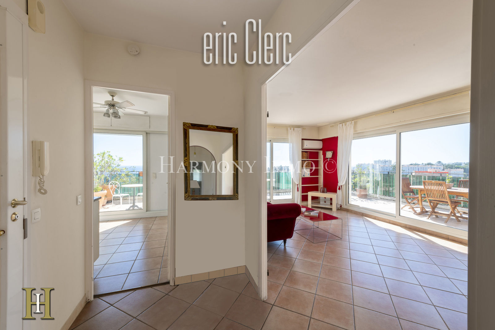 Nice (06200)NICE OUEST, FACULTÉ DES LETTRES. DERNIER ÉTAGE D'ANGLE, VUE PANORAMIQUE MER et VILLE, DEUX PIÉCES d'une SURFACE HABITABLE de 69 M2 ouvert sur une VASTE TERRASSE CIRCULAIRE de 70 M2, DOUBLE EXPOSITION dont SUD/EST et SUD/OUEST. L'entrée dessert la cuisine indépendante, le salon d'angle, la chambre, la salle d'eau avec wc. SURFACE LOI CARREZ 56 m2. LE PLUS : une pièce supplémentaire de 13 m2 indépendante -chambre, bureau ou atelier d'artiste. Une modernisation lui permettra d'exprimer pleinement tout son potentiel. Chauffage collectif. DPE classe E. La copropriété est sécurisée, arborée, dispose de deux piscines, d'une salle de sport. Charges mensuelles de copropriété 340 €. Une cave.La copropriété comporte 290 lots principaux . Aucune procédure en cours à notre connaissance. Annonce proposée par Eric CLERC - EI - RCS NICE 431 516 632. Prix 499 000 €. . Garage en option 49 000 €.