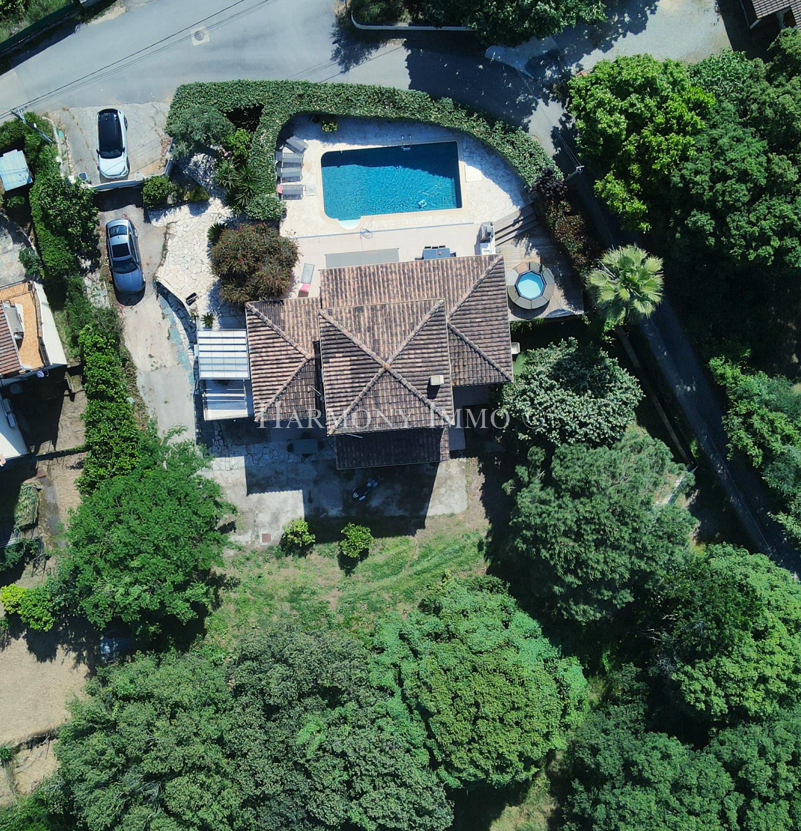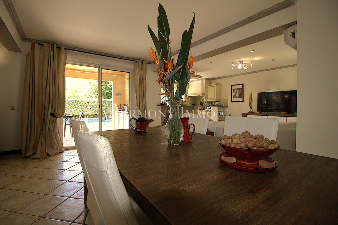Le véritable art de vivre se déploie à l'extérieur : depuis le salon, une terrasse couverte conduit à l'espace piscine, composé d'un bassin raffiné (9 x 4,5 m) aux margelles en pierre de Bavière, d'un jacuzzi niché dans son coin et d'un barbecue pour les convivialités estivales.