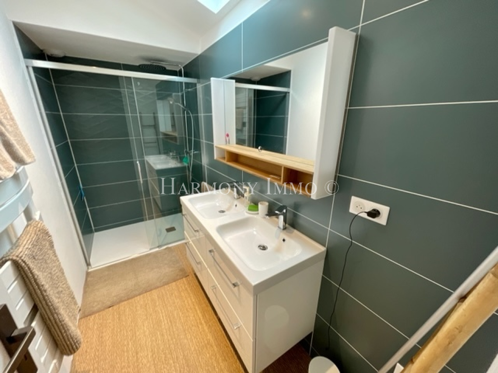 Au premier étage, un espace séjour-salon avec cuisine ouverte aménagée et équipée de 44m² plus une terrasse couverte de 15 m² soit un total d'environ 60 m² d'espace de vie.