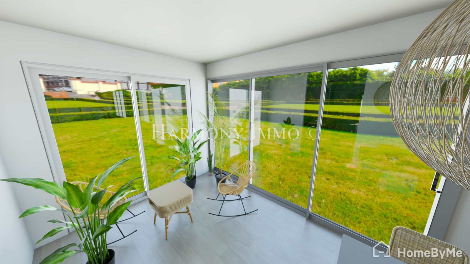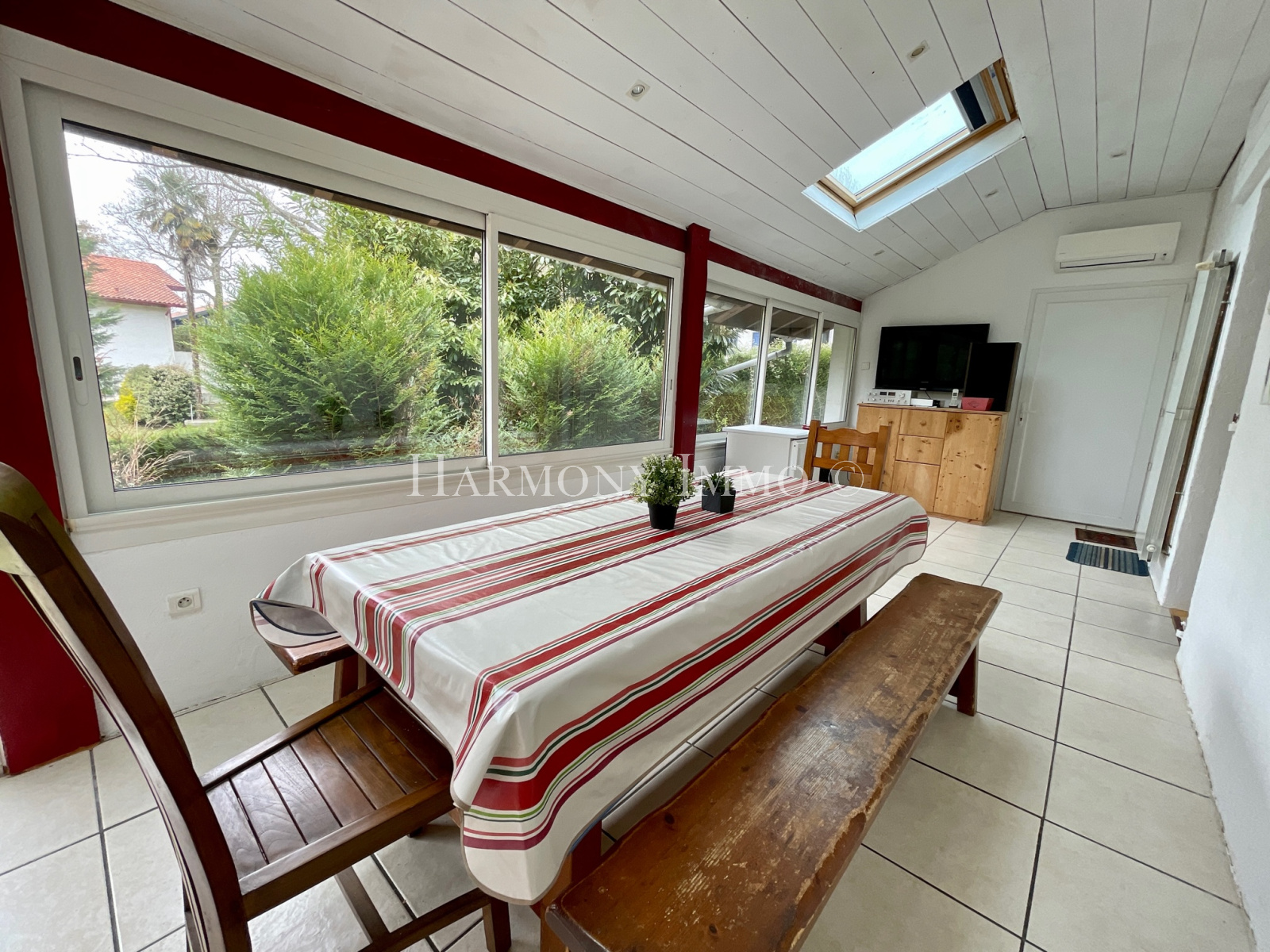 Une entrée donnant accès à un spacieux séjour, une cuisine, un espace véranda sans vis à vis, une première chambre, une salle de bains, un Wc.
