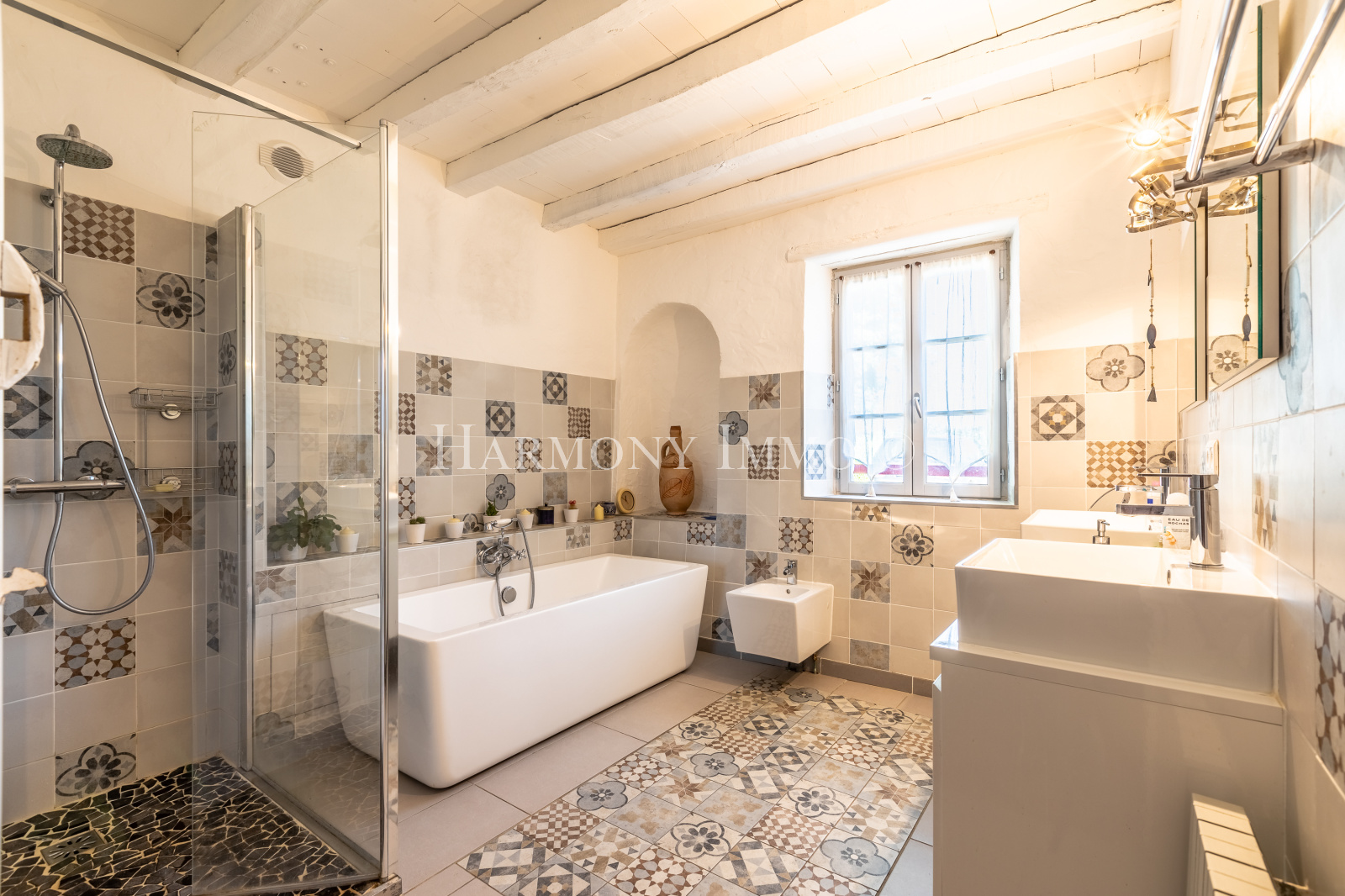 - Une salle de bains avec douche et baignoire
