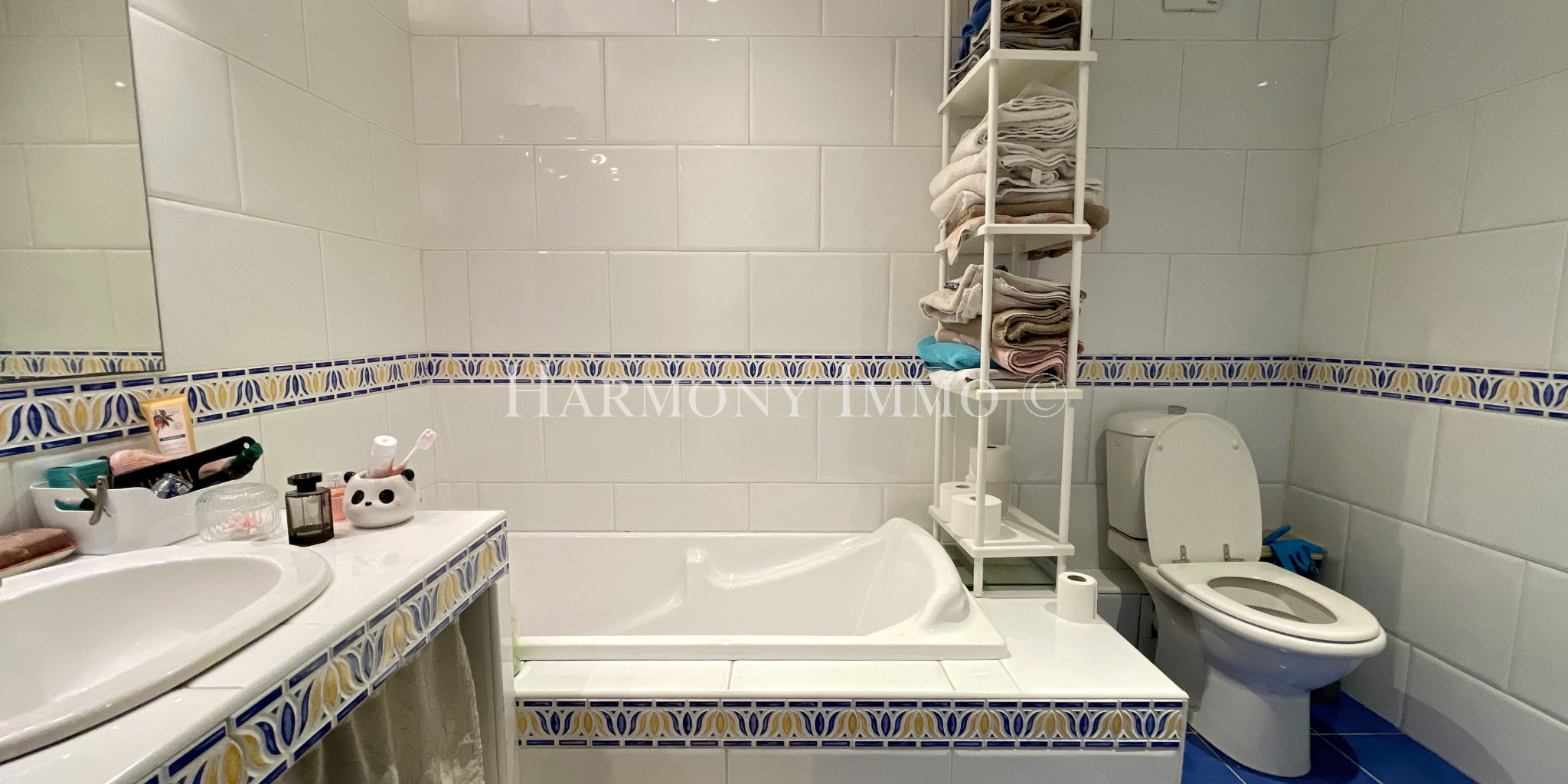 L'appartement dispose également d'une salle de bains avec douche et baignoire, d'un WC, et de nombreux rangements.