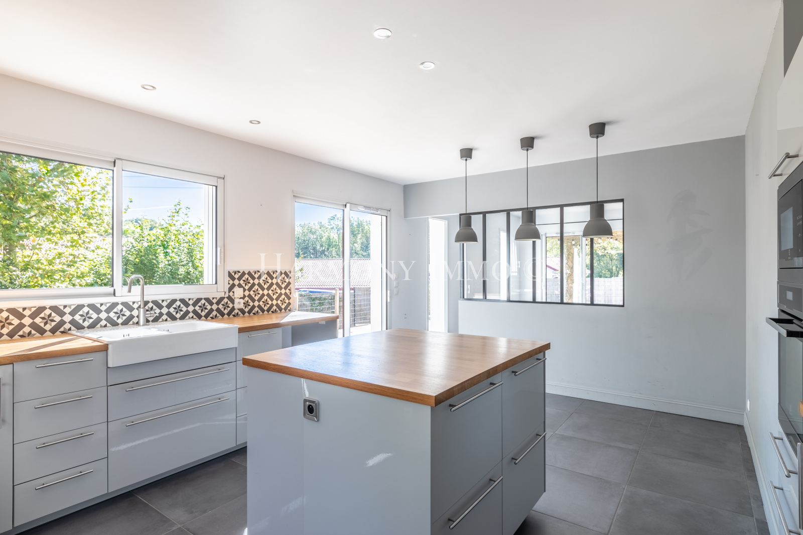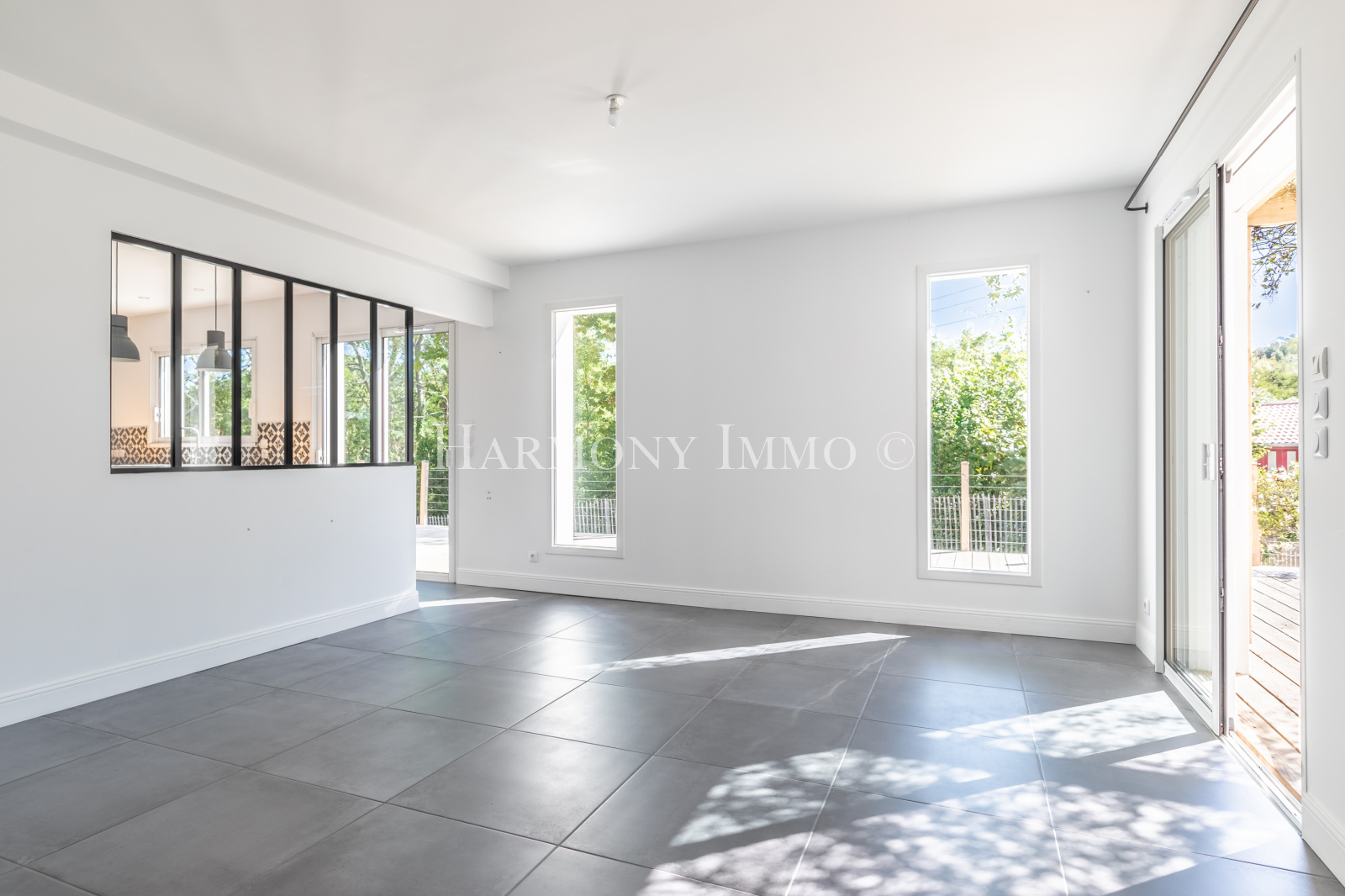 Elle se compose d'une entrée, d'une belle pièce de vie, un salon avec plafond cathédrale, une cuisine familliale aménagée et équipée séparée par une verrière, une arrière cuisine, une buanderie, une chambre, une pièce atelier avec accès exterieur.