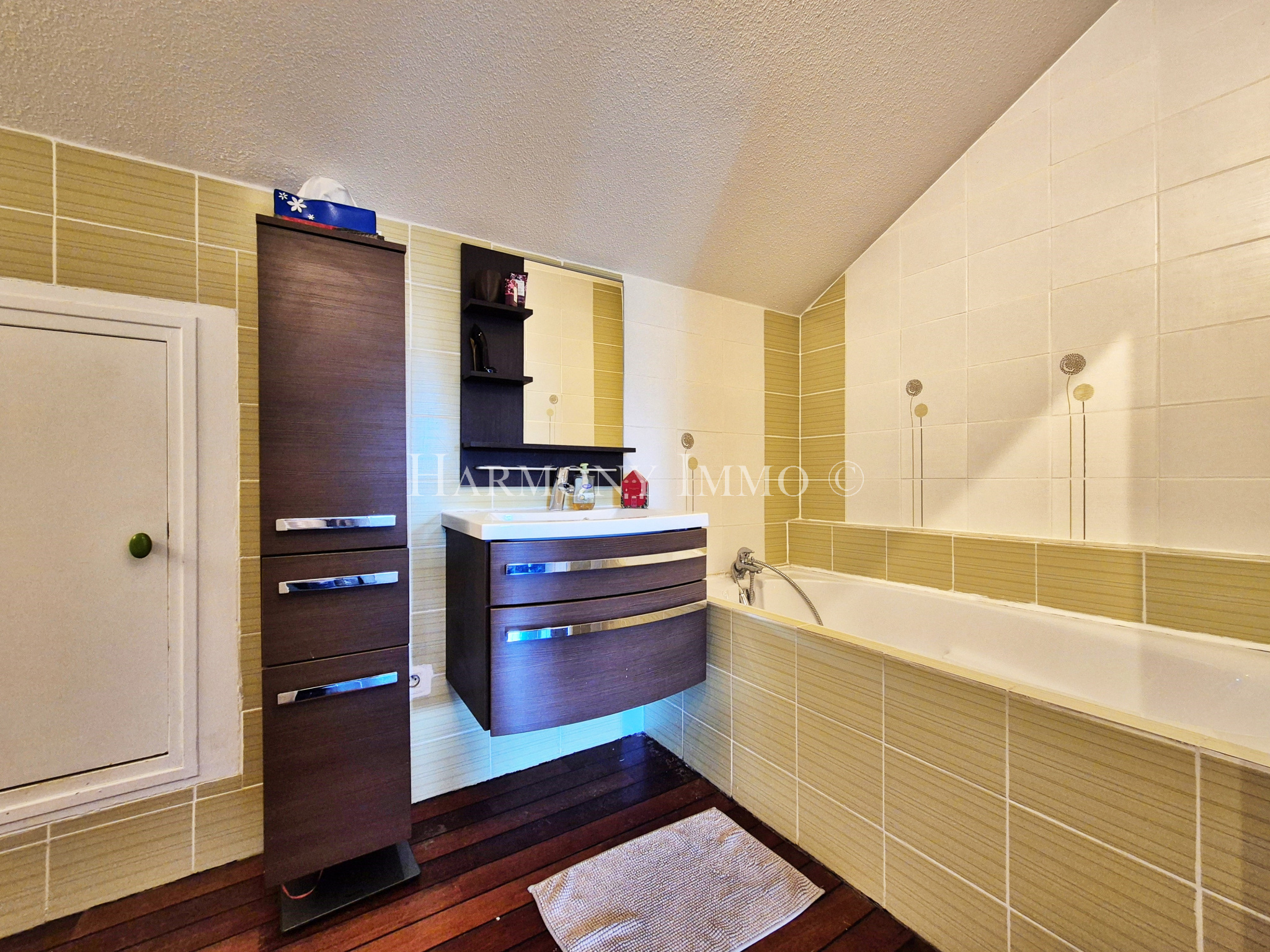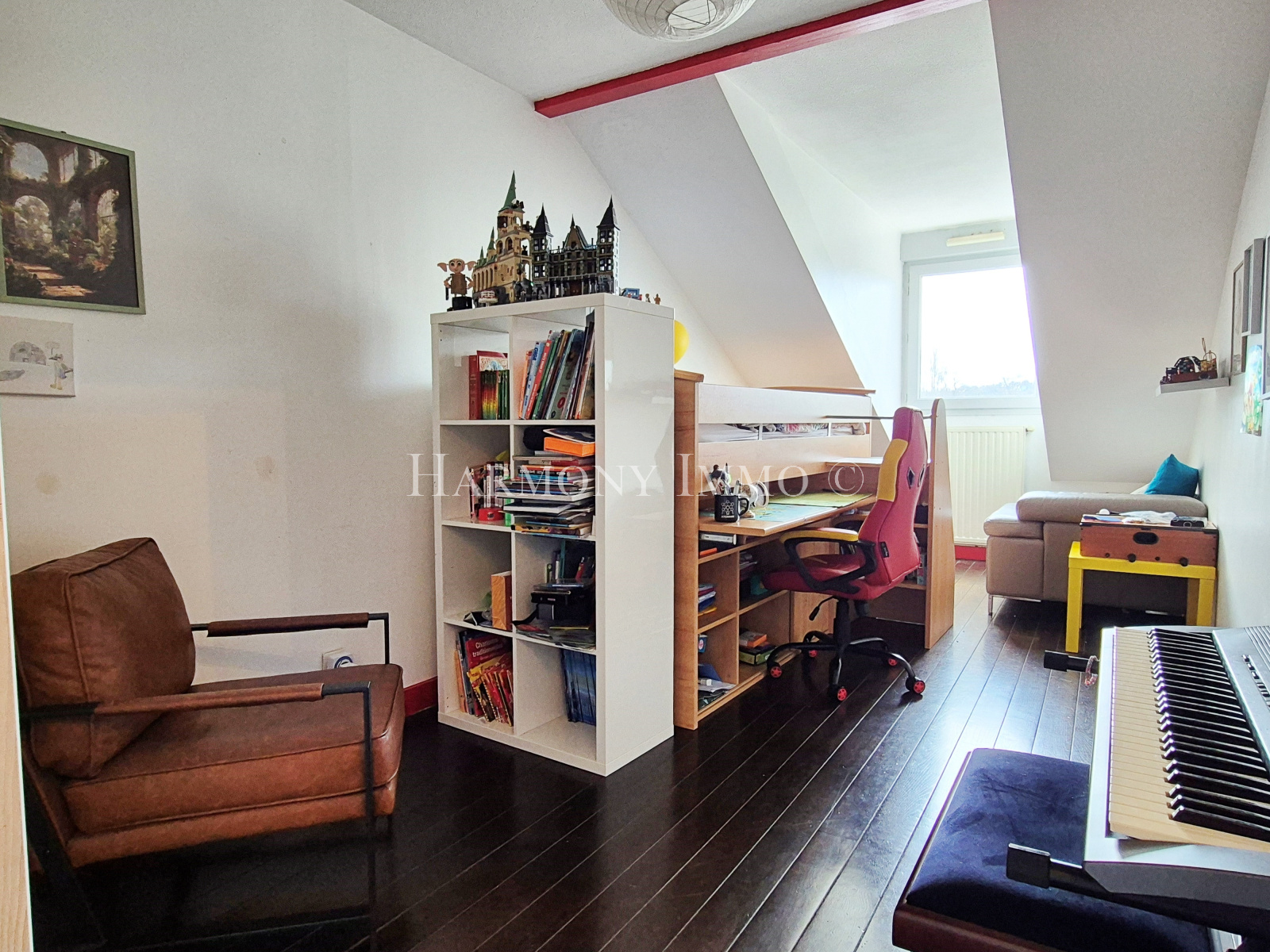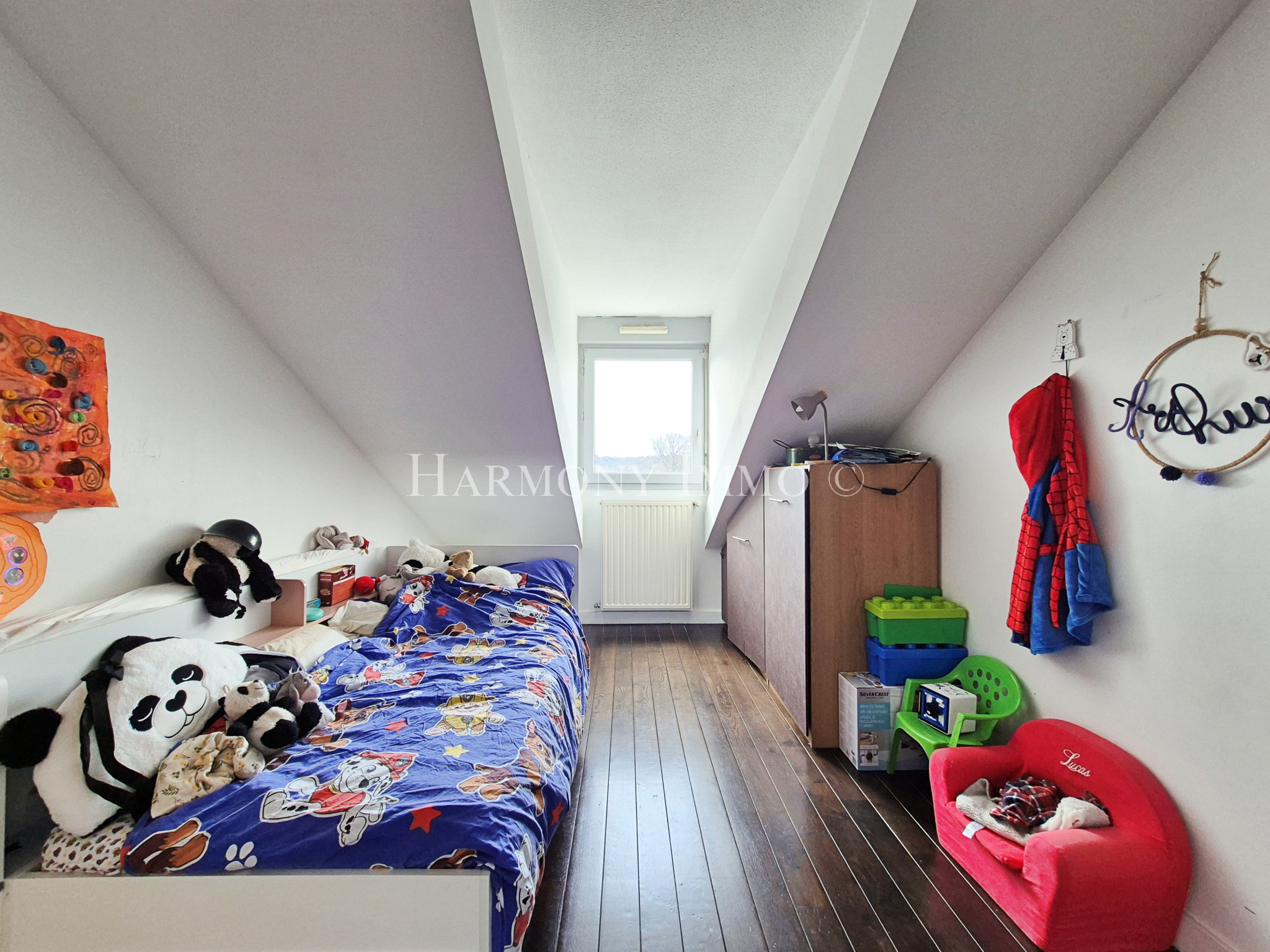 L'étage supérieur acueille l'espace nuit composé de 2 grandes chambres de 11,2 m² (15,65 m² au sol) avec placard et de 14,2 m² (17,75 m² au sol), d'une salle de bains avec douche, baignoire et WC. Un grenier aménagé de 13,65 m² offrant une belle surface de rangement complète ce niveau.