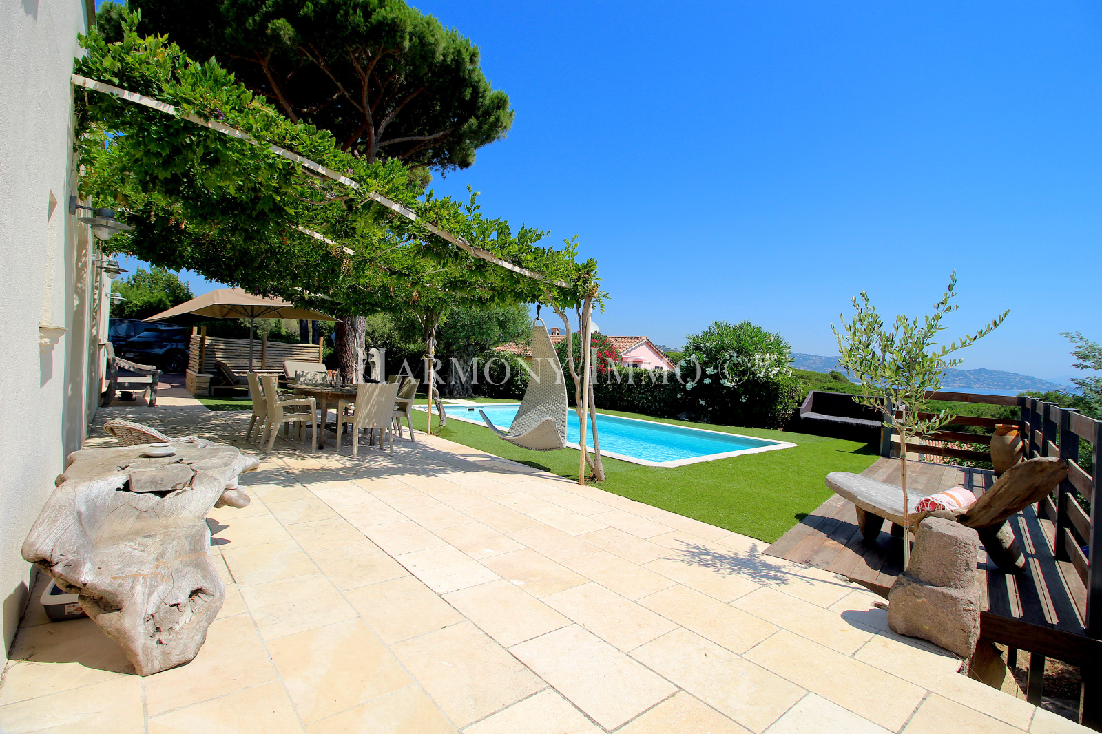 Sainte-Maxime (83120)VENDU PAR NOTRE AGENCE. Magnifique villa de 195 m² avec piscine, bénéficiant d'une trés belle vue mer. Elle se compose d'un grand séjour, salle à manger de 70 m² avec ouverture face à la mer, terrasse, cuisine, 1 chambre de Maître ouvrant sur terrasse avec vue mer, 1 dressing, 1 salle de bain avec douche et baignoire, double vasque, 3 chambres, 1 salle de bain, 1 salle d'eau. Préstations haut de gamme. Climatisation réversible, baies à galandage (gainanable donc invisible), garage, buanderie, parking. terrain arboré de 1250 m². Produit d'exception.