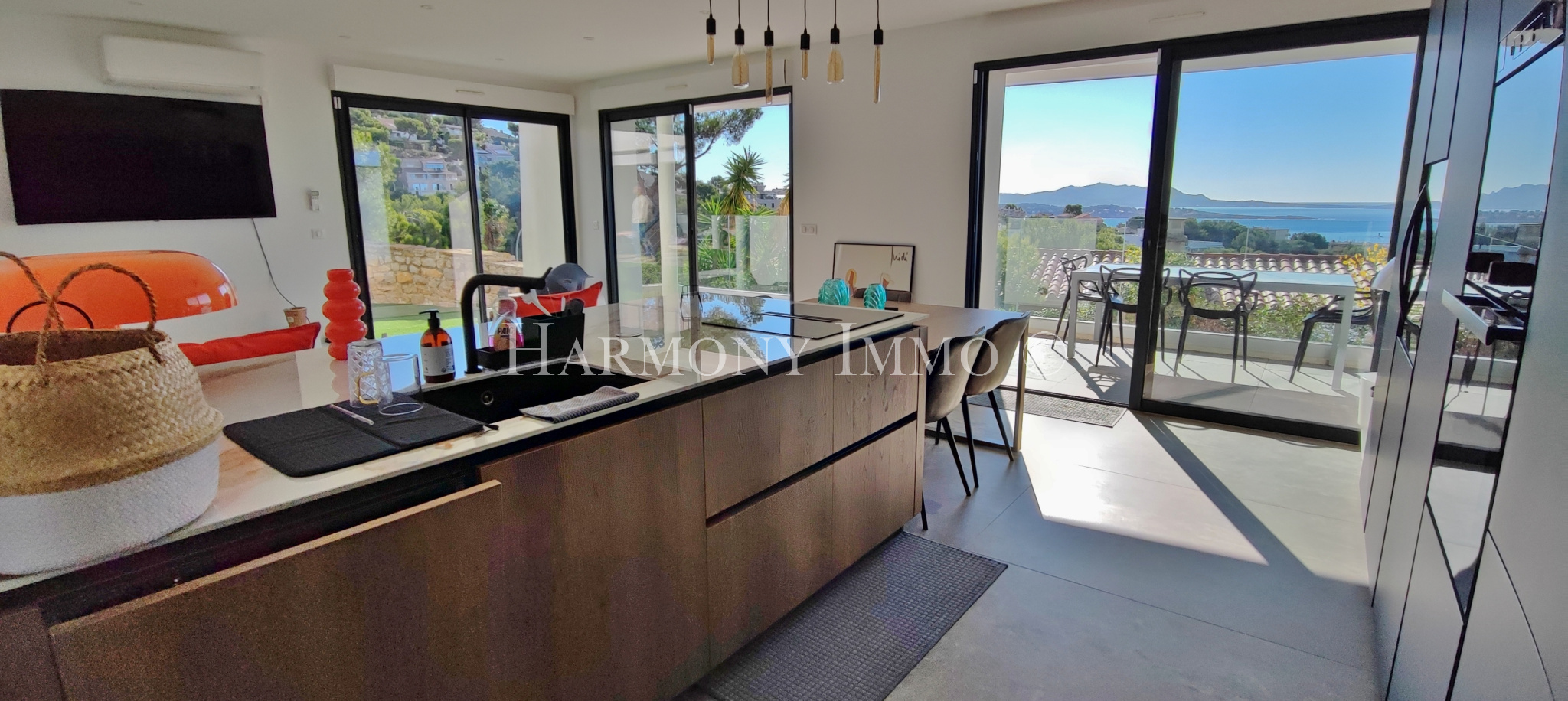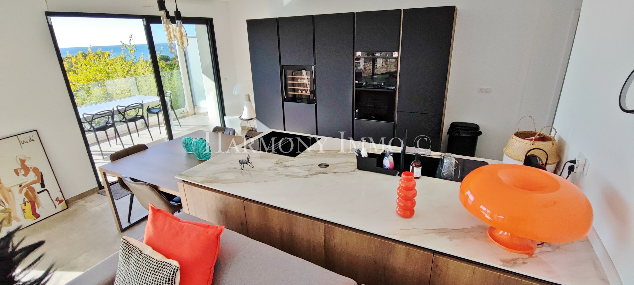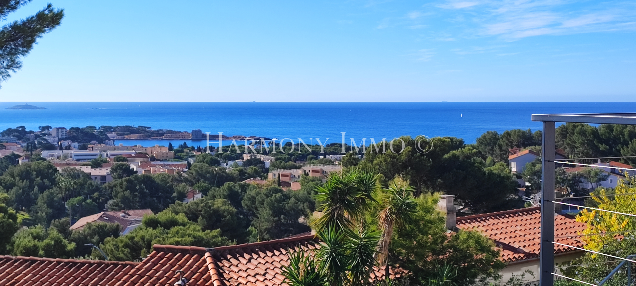 Bandol (83150)Sublime Vue Mer sur l'île de Bendor jusqu'au Gaou ! Appartement T4 de 100m² en rez-de-jardin, entièrement rénové et meublé pour une ambiance déco pleine de Peps, implanté dans une petite copropriété de 4 logements. Le vaste séjour d'une superficie de 40m² comprend une luxueuse et fonctionnelle cuisine équpée dotée d'un îlot central qui s'étend sur son balcon Sud face à la mer et donnant sur le jardin. Trois chambres équipées de leur SDD et placard, dont une vue mer sur jardin avec dressing, une buanderie, deux toilettes. Conviviale terrasse couverte de 28m² alimentée pour accueillir une cuisine d'été et profiter de belles tablées estivales ainsi qu'un exceptionnel solarium en Roof Top pouvant recevoir un jacuzzi avec vue sur la "Grande bleue"! Deux places de parking privatives, une cave. Calme absolu, à 10mn à pied des commerces ( Supermarché-Pharmacie-Boulangerie-Restaurant) et à seulement 2 kms du port de Bandol ! Ce bien allie délicieusement la légèreté du vivre en appartement tout en bénéficiant des extérieurs d'une villa sans entretien, le rêve !