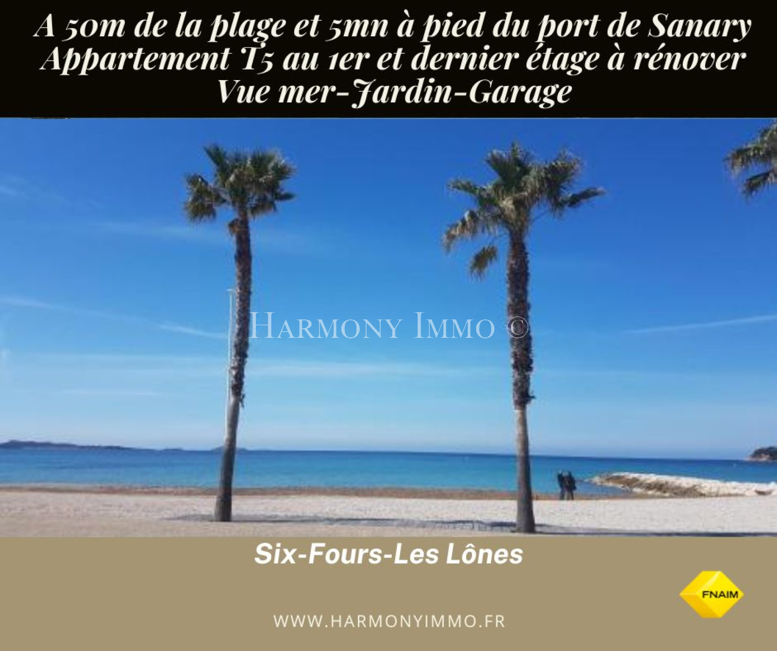Six-Fours-les-Plages (83140)Exclusivité- Idéalement situé à 50m de la plage, les commerces à proximité immédiate et à 5mn à pied du ravissant port de Sanary/mer, ce vaste appartement T5 vue mer d'une superficie de 102m² au 1er et dernier étage est agrémenté de son jardin de 300m², d'un garage et d'une cave. Salon/salle à manger communiquant par la cheminée, cuisine séparée pouvant être ouverte offrant ainsi une fabuleuse pièce de vie. L'espace nuit se compose de trois chambres dont deux sur la terrasse, une SDD, une SDB, toilettes séparées. Ce haut de villa deviendra un petit joyau d'exception après rénovation ! Aucun vis-à-vis du rez-de-chaussée.