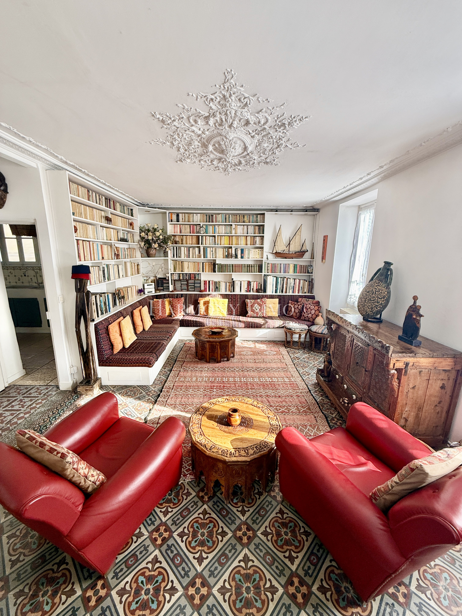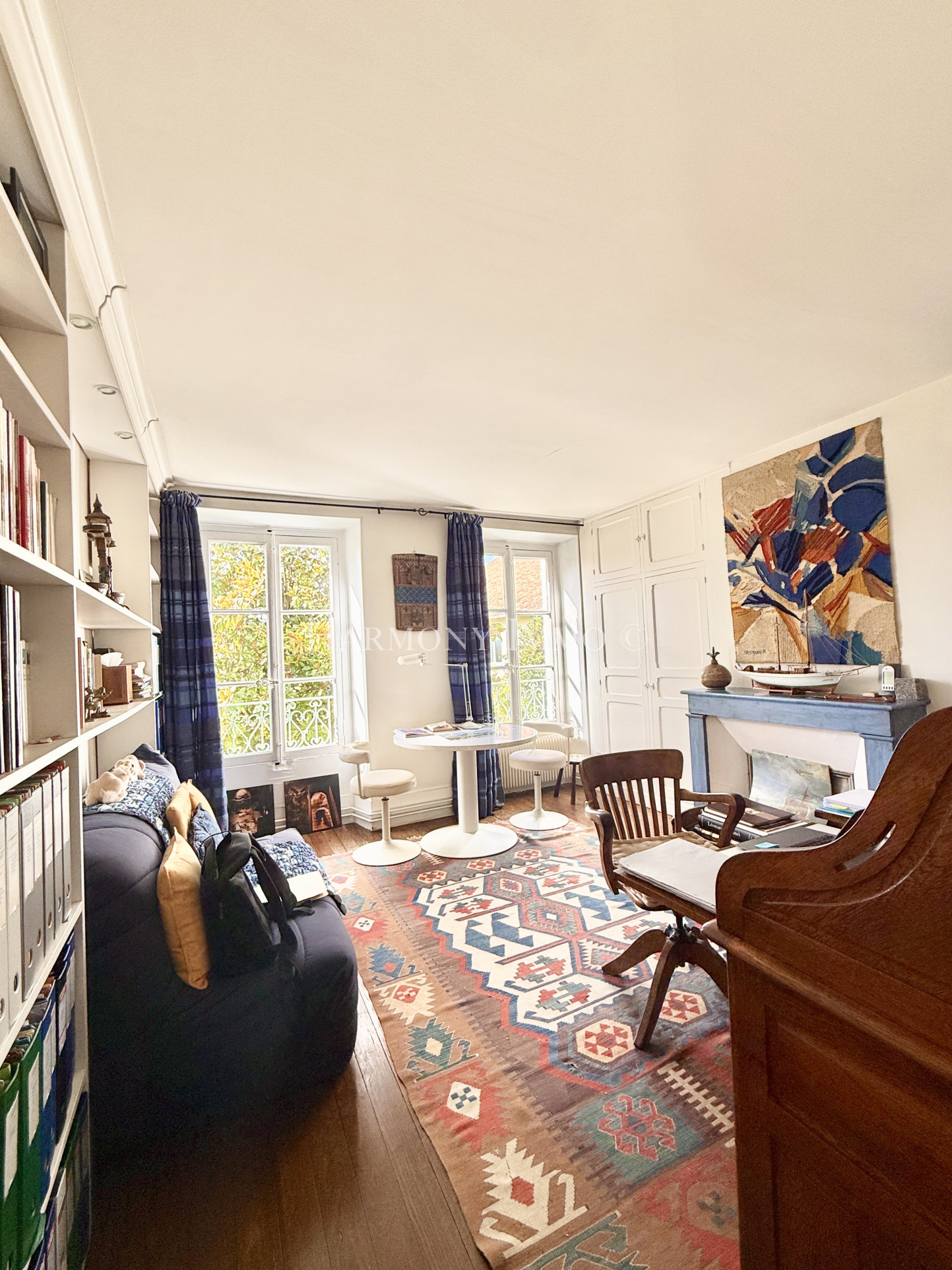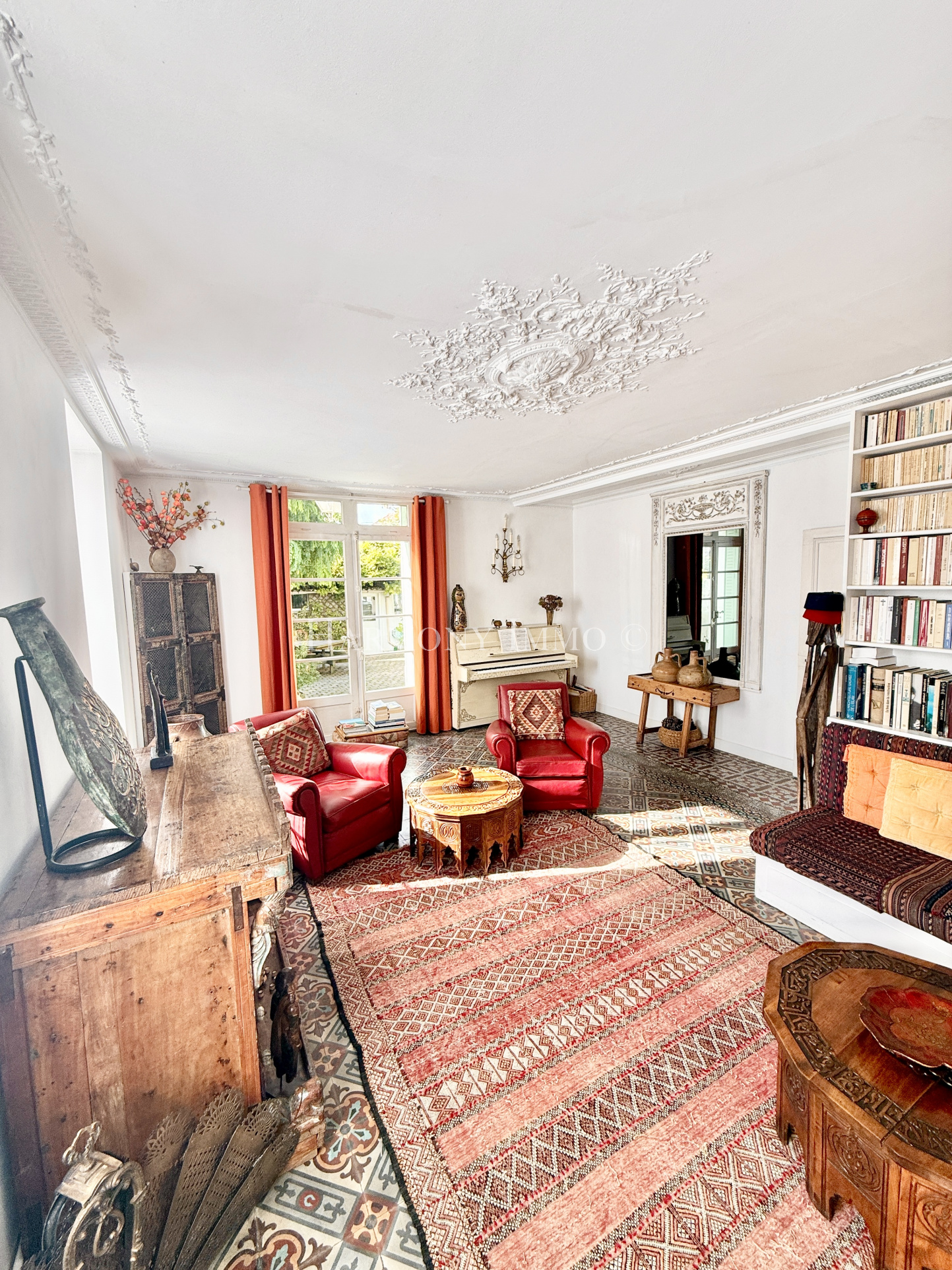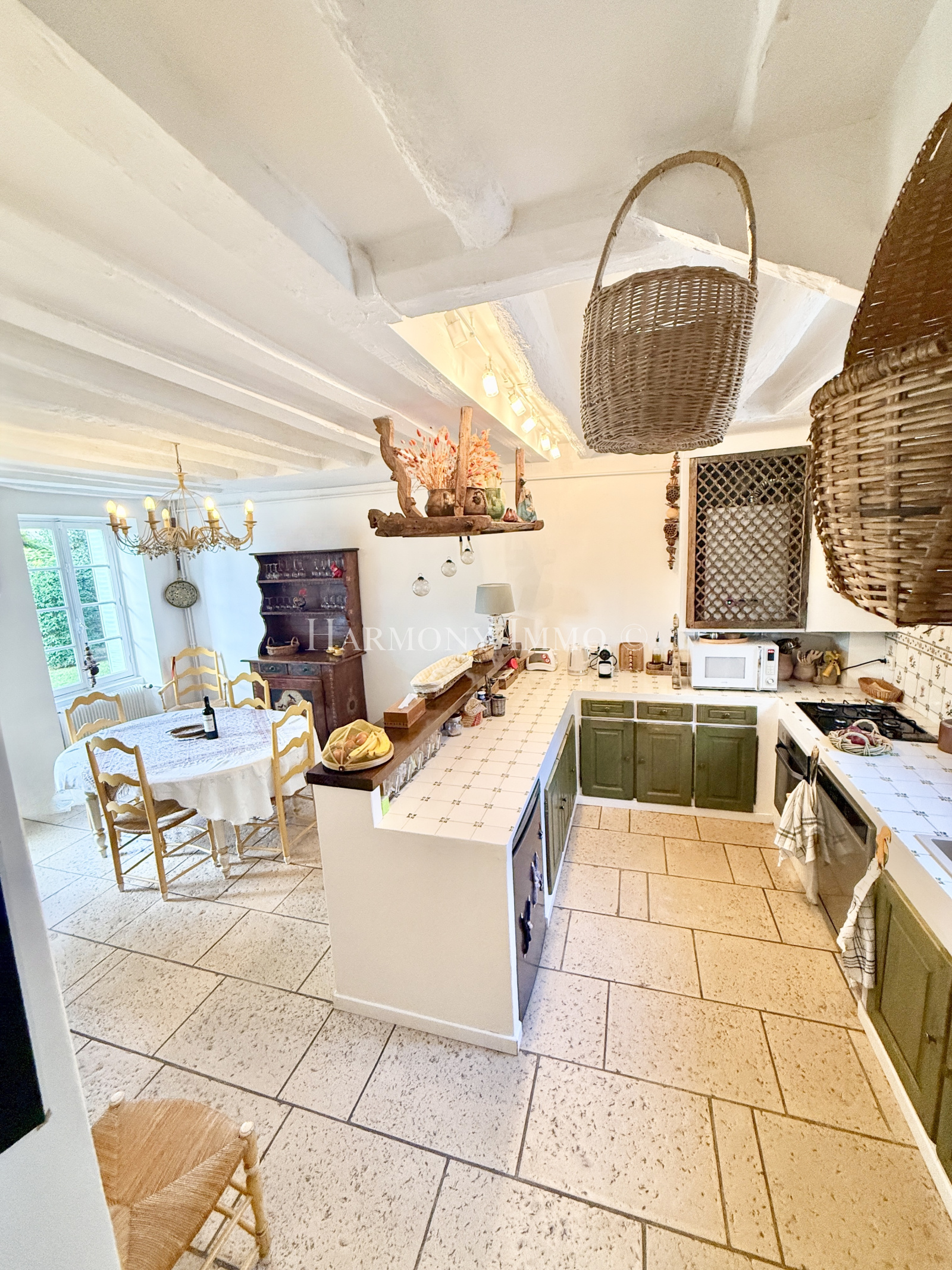 Dès l'entrée, vous découvrez une vaste cuisine avec espace repas, puis un salon bibliothèque à l’atmosphère chaleureuse. Une porte-fenêtre offre un accès direct au jardin.