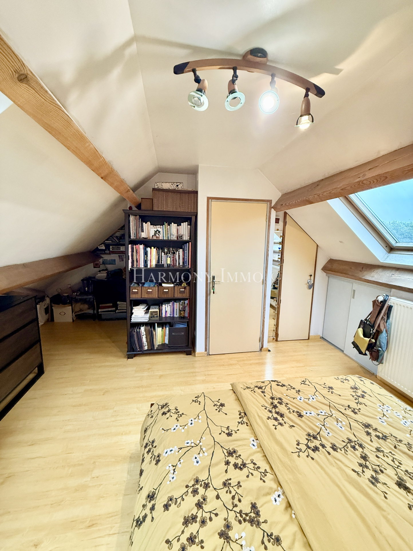 Les combles sont aménagés en une grande chambre, bénéficiant d’une belle hauteur sous plafond, idéale pour une suite parentale ou un espace polyvalent.