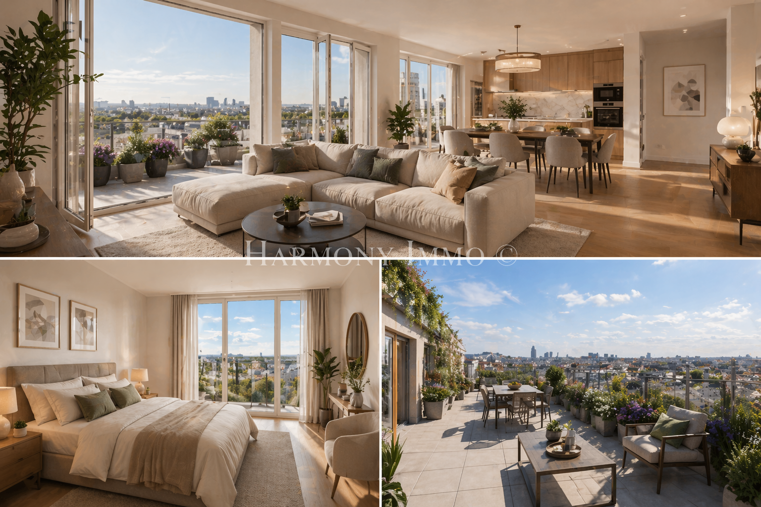 Dès l’entrée, vous profitez d’une belle pièce de vie de plus de 37 m², baignée de lumière, avec une cuisine ouverte donnant directement sur une terrasse de 57 m² exposée Ouest.